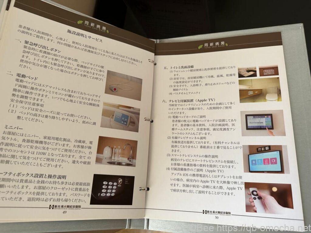 同新病房有點像飯店,裝潢比較沒有壓力感,設備也是很完善,如:冰箱、免治馬桶、烘碗機、盥洗用品(僅一份)、日系病人服、免費報紙、整套全新毛巾、瓶裝水、煮水壺、大電視、食物磅秤、衛生紙、濕紙巾等等。