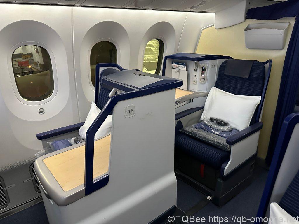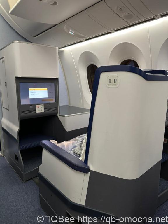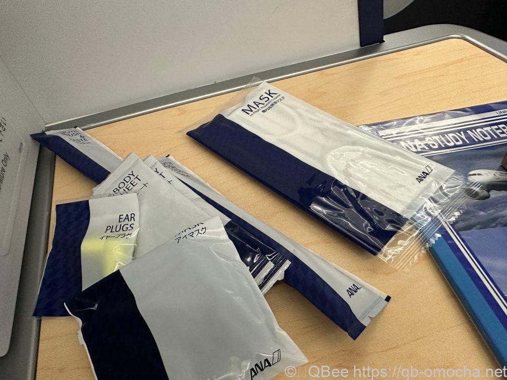 座位上有拖鞋、耳機、枕頭、床墊、棉被。機上也提供一些備品,如:口罩、紙巾、牙刷、耳塞、眼罩、男性用臉部乳液(沒有女性用)等等,廁所有提供漱口水及擦臉的紙巾。