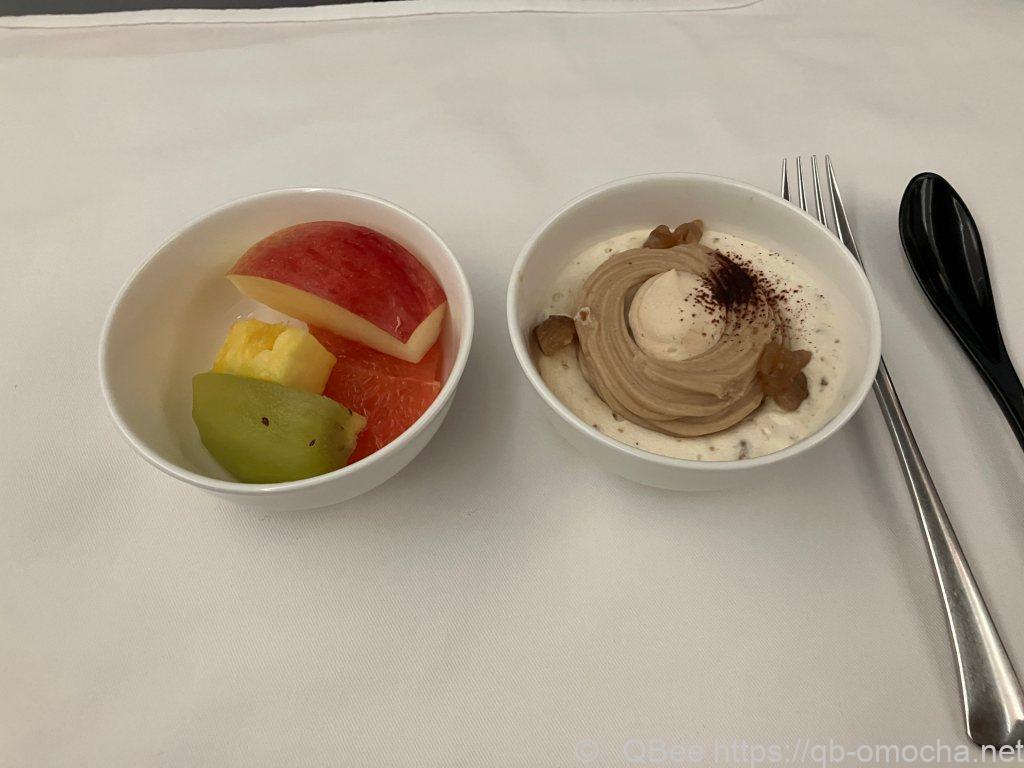 點心有水果、栗子布丁、起司。吃了前兩個都不錯,布丁很甜。餵完小孩後,起司已經沒有了,嗚嗚。